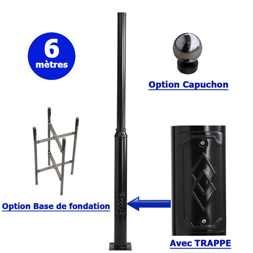 Mât / Poteau pour lampe de rue - Série STANDARD V2 EVO avec TRAPPE - Vis antivol - 6 mètres - Entraxe latéral des trous 200mm - Couleur Noir - Base de fondation incluse - Tête de mât et capuchon en option