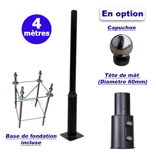 Mât / Poteau pour lampe de rue - Série STANDARD V1 EVO - 4 mètres - Entraxe latéral des trous 200mm - Couleur Noir - Base de fondation incluse - Tête de mât et capuchon en option