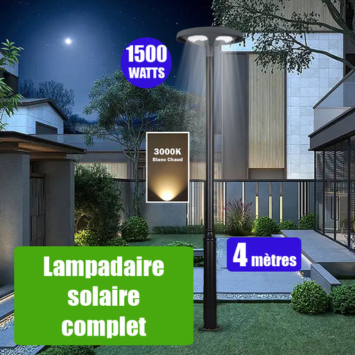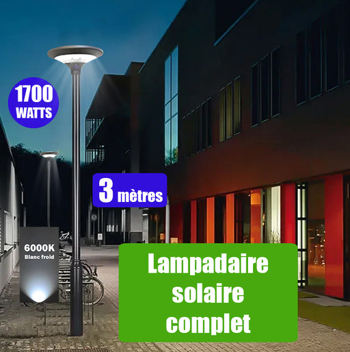 Pack lampadaire solaire complet 3 mètres : Lampe de rue et parking Solaire - Série OVNI FUTUR V2 - 1500 Watts - 3200 Lumens - 6000k + Mât STANDARD V1 EVO 3 mètres ou Mât STANDARD V4 EVO 3 mètres