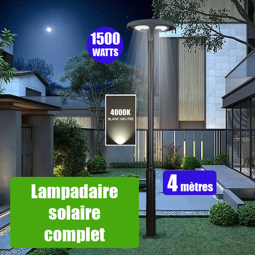 Pack lampadaire solaire complet 4 mètres : Lampe de rue et parking Solaire - Série OVNI FUTUR V2 - 1500 Watts - 3200 Lumens - 6000k + Mât STANDARD V1 EVO 4 mètres ou Mât STANDARD V4 EVO 4 mètres - Avec trappe