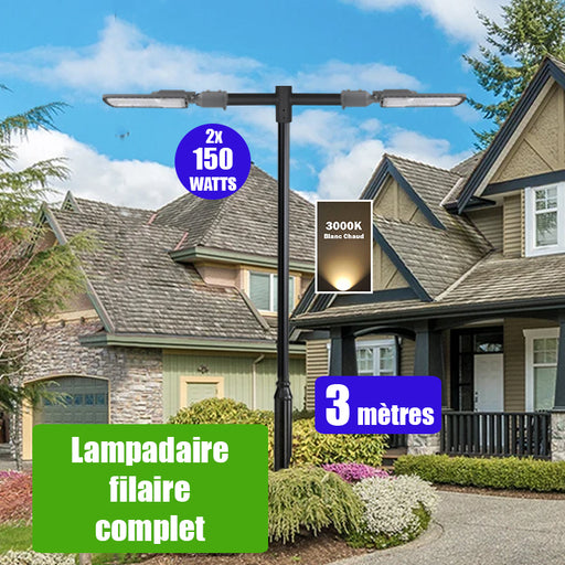 Pack lampadaire filaire complet double tête 3 mètres : 2x Lampes de rue filaire - Série FLEX ECO - 150 Watts - 3000k + Mât STANDARD - 3 mètres avec trappe au choix (STANDARD V2 EVO ou STANDARD V4 EVO) + Double tête de mât en ligne ou perpendiculaire