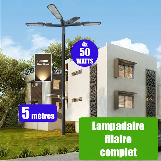 Pack lampadaire filaire complet quadruple tête 5 mètres : 4x Lampes filaires - Série FLEX ECO - 50 Watts - 6000k + Mât STANDARD 5 mètres avec trappe au choix (STANDARD V2 EVO ou STANDARD V4 EVO) + Quadruple tête de mât + 4x Adaptateurs 60/50 ajustable