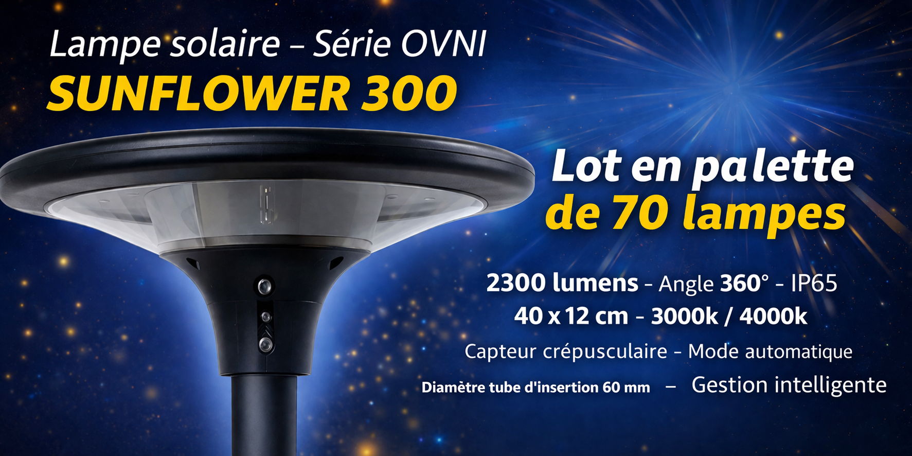 Palette de 70x Lampes solaires - Série OVNI SUN FLOWER V1 - Rendu lumineux 300 Watts - 2300 lumens - Angle 360° - IP65 - 40 x 12 cm - CCT 3000k/4000k - Capteur crépusculaire - Mode automatique - Tube d'insertion 60 mm - Gestion de l’éclairage intelligent