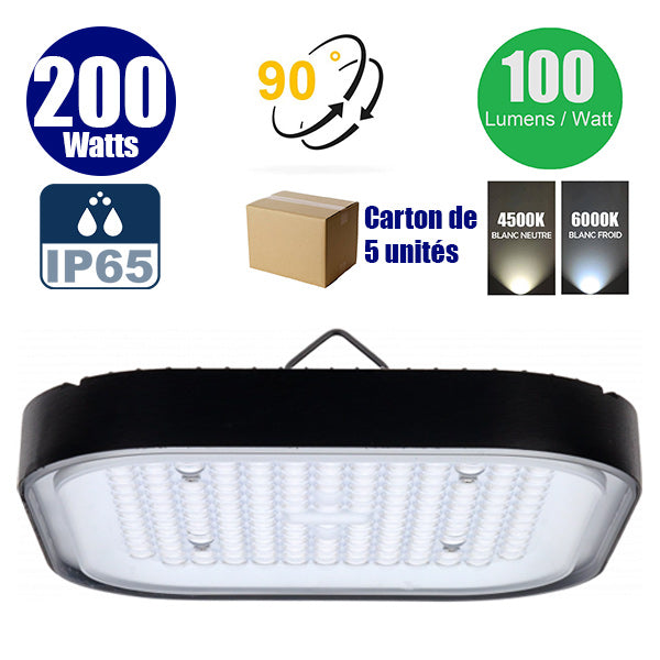 Carton de 5x Lampes industrielles LED - Série SQUARE - 200 Watts - 20 000 Lumens - 100 Lumens/Watt - Angle 90° - 32 x 32 x 11 cm - IP65 - 4500k / 6000k au choix