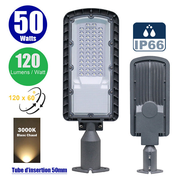 Lampe de rue filaire - Série FLEX ECO - 50 Watts - 6000 Lumens - 120 Lumens/Watt - Angle 120 x 60° - IP66 - IK08 - 493 x 170 x 70mm - Tube d'insertion 50mm - 3000k