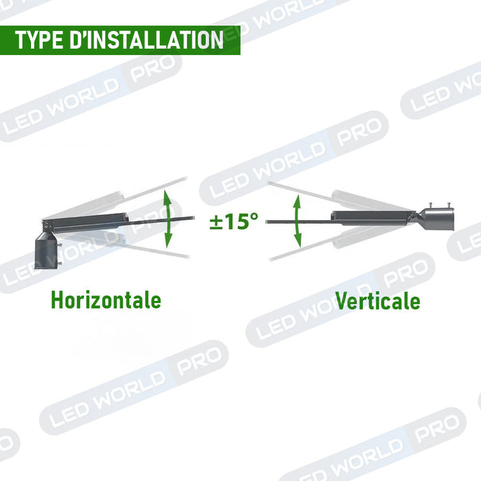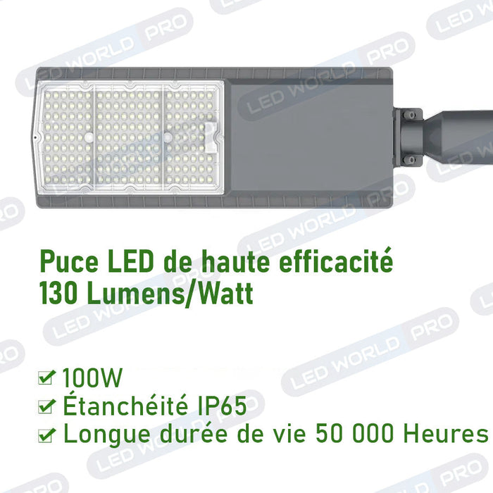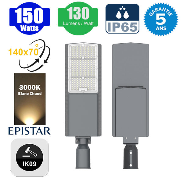 Lampe de rue filaire - Série FLEX V2 - 150 Watts - 19 500 Lumens - 130 Lumens/Watt - IP65 - IK09 - Angle 140x70° - 62 x 46 x 2 cm - 3000k – Angle rotatif ajustable - Tube d'insertion 50/60mm - Garantie 5 ans