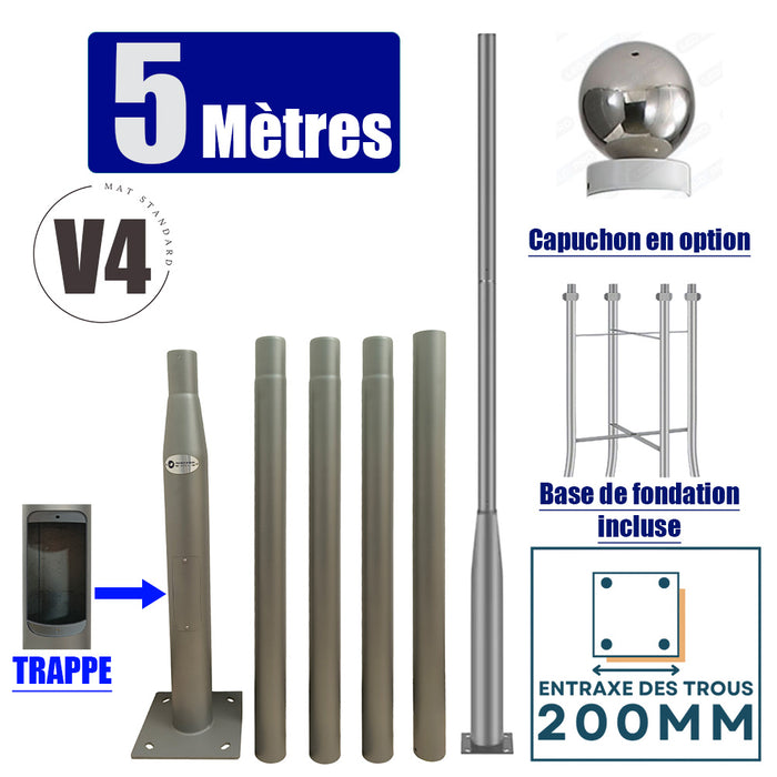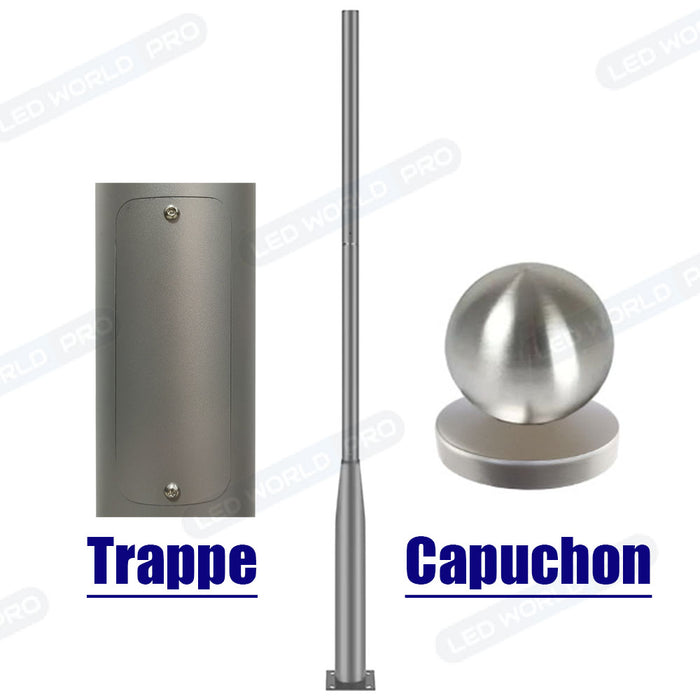 Mât / Poteau pour lampe de rue - Nouveau design - Série STANDARD V4 EVO avec TRAPPE - Vis antivol - 5 mètres - Entraxe latéral des trous 200mm - Couleur GRIS - Finition épurée - Base de fondation incluse / capuchon en option
