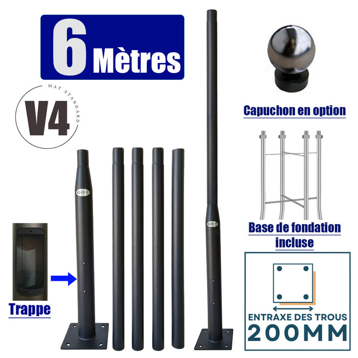 Mât / Poteau pour lampe de rue - Nouveau design - Série STANDARD V4 EVO avec TRAPPE - Vis antivol - 6 mètres - Entraxe latéral des trous 200mm - Couleur NOIR - Finition épurée - Base de fondation incluse / capuchon en option