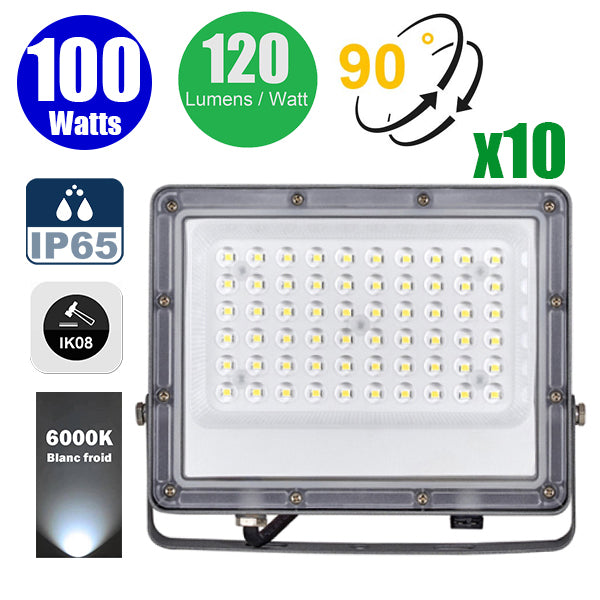 Pack de 10x Projecteurs LED filaires - Série PERLE V2 - 100 Watts - 12 000 Lumens - 120 Lumens/Watt - Angle 90° - IP65 - 6000K - 290 x 230 x 25 mm