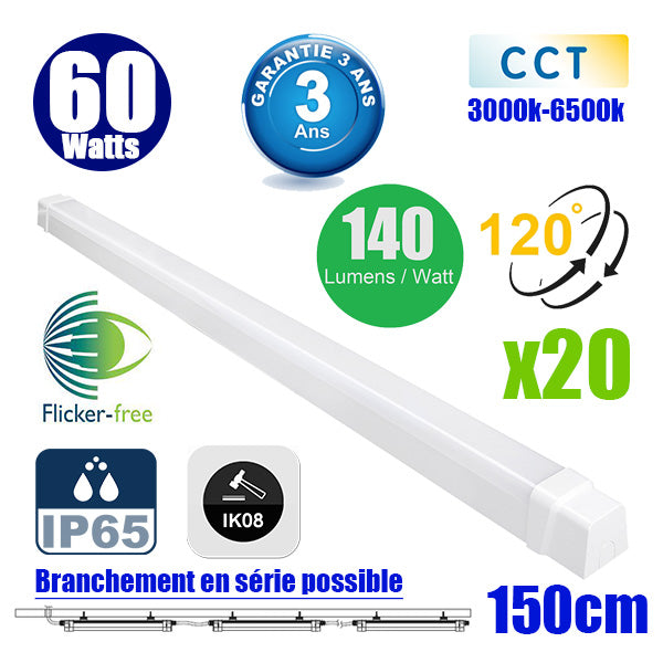 PACK DE 20 REGLETTES LED CCT 150CM - 60 WATTS !