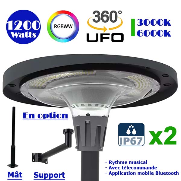 Pack de 2x Lampes LED solaires - Série OVNI FUTUR - RGBWW - Type UFO - 1200 Watts - 2800 lumens - Panneau Monocristallin - Diamètre tube d'insertion 76 mm - Télécommande - Application mobile Bluetooth - Rythme musical - Couleur 3000K / 6000K / RGB
