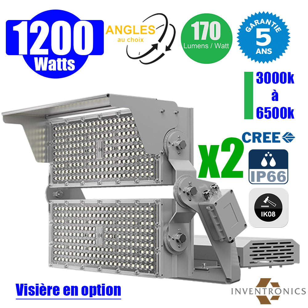 Pack de 2x Projecteurs hautes puissances LED de stade filaire - Série EVOLUTION V2 - 1200 Watts - 204 000 Lumens - 170 Lumens/Watt - Angle 20° / 30° / 60° / 90° / MBP20 / MLP30 / MBP45 / MBP70 au choix - 3000K à 6500K - Visière en option - Garantie 5 ans