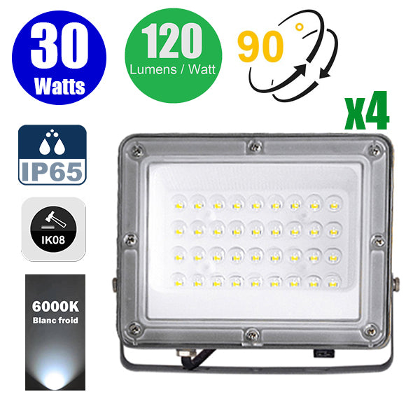 Pack de 4x Projecteurs LED filaires - Série PERLE V2 - 30 Watts - 3600 Lumens - 120 Lumens/Watt - Angle 90° - IP65 - 6000K - 150 x 123 x 25 mm