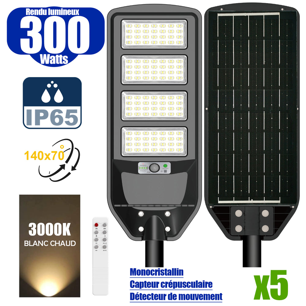 Pack de 5x Solaires - Luminaire LED pour Candélabre / Lampe de rue et parking - Série VIEW V2 - 300 Watts - 2300 Lumens - Angle 140*70° - Lampe 62 x 25 x 5 cm - Panneau MONOCRISTALLIN - 51 x 23 cm - Détecteur de mouvement - 3000k - Tube d'insertion 45mm