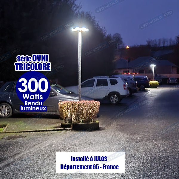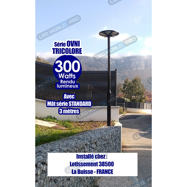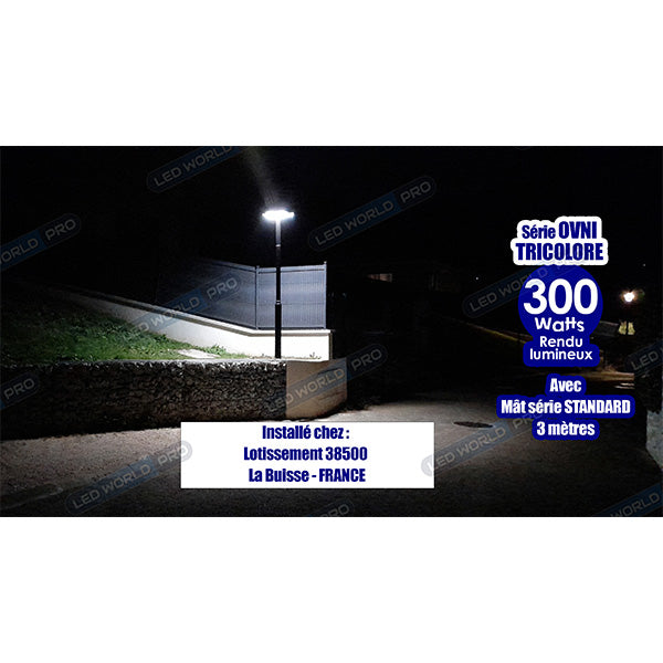 Pack lampadaire complet 4 mètres : Lampe solaire Série OVNI TRICOLORE 300 Watts 3000K / 4000K / 6000K + Mât STANDARD 4 mètres (V1 EVO ou V4 EVO - Avec trappe)