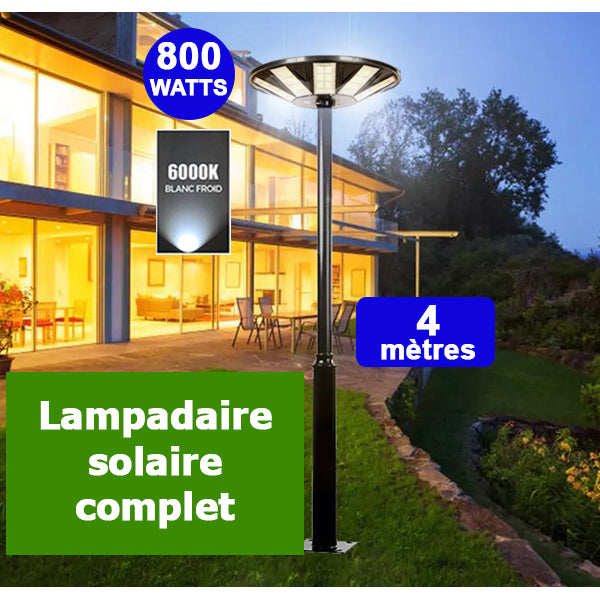 Pack lampadaire complet 4 mètres : Lampe solaire Série OVNI HERCULE 800 Watts - 2700 Lumens - 6000K - Angle 360° + Mât STANDARD 4 mètres (V1 EVO ou V4 EVO - Avec trappe)