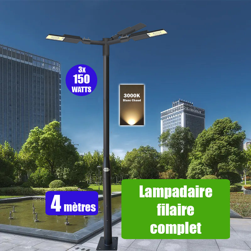Pack lampadaire complet triple tête 4 mètres : 3x Lampes LED filaires Série FLEX V2 - 150 Watts - 3000k + Mât STANDARD - 4 mètres avec trappe au choix (STANDARD V2 EVO ou STANDARD V4 EVO) + Triple tête de mât perpendiculaire