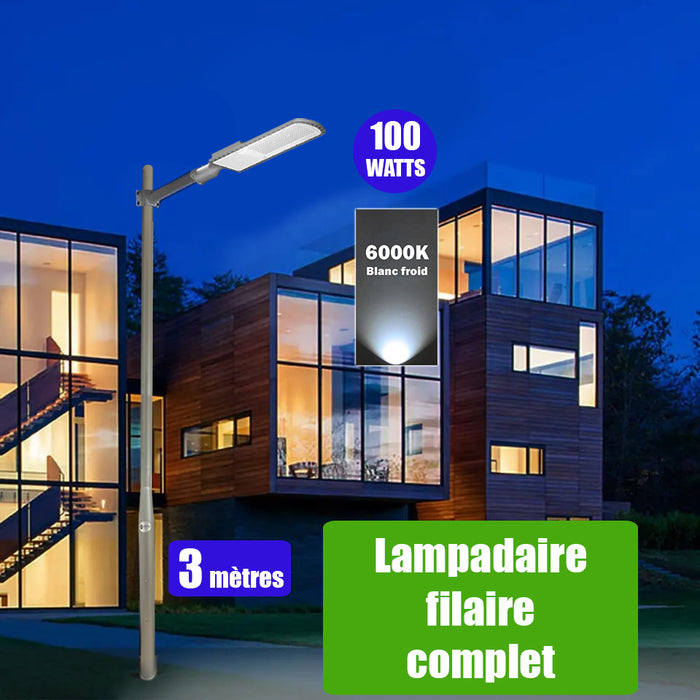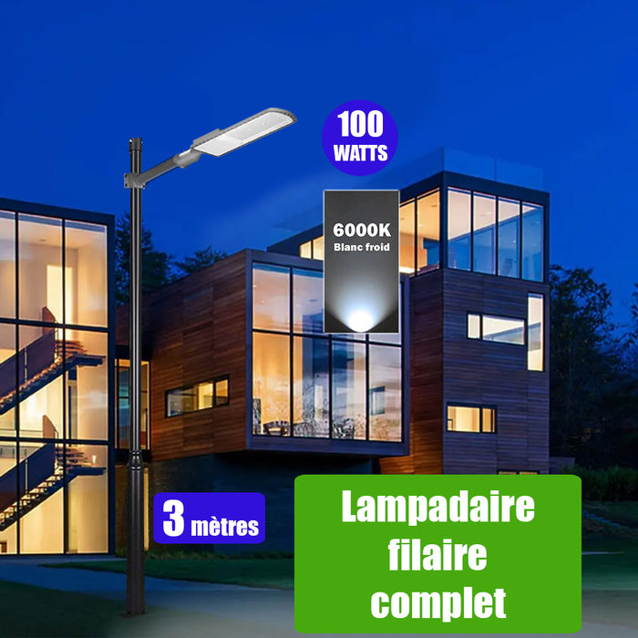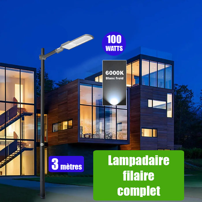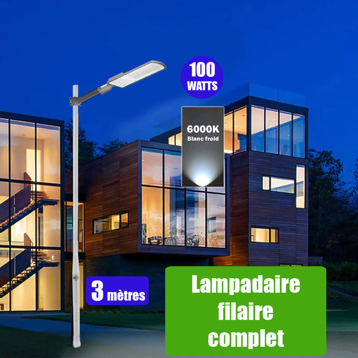Pack lampadaire filaire complet 3 mètres : Lampe de rue filaire - Série FLEX ECO - 100 Watts - 6000k + Mât STANDARD - 3 mètres avec trappe au choix (Série STANDARD V2 EVO ou Série STANDARD V4 EVO) + Support déporté 45mm ou Adaptateur rotatif 80/50 mm
