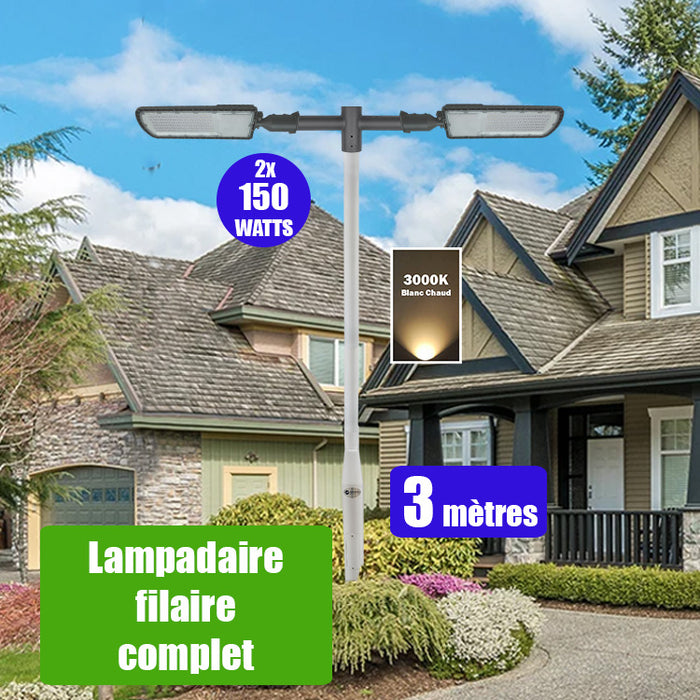 Pack lampadaire filaire complet double tête 3 mètres : 2x Lampes de rue filaire - Série FLEX ECO - 150 Watts - 3000k + Mât STANDARD - 3 mètres avec trappe au choix (STANDARD V2 EVO ou STANDARD V4 EVO) + Double tête de mât en ligne ou perpendiculaire