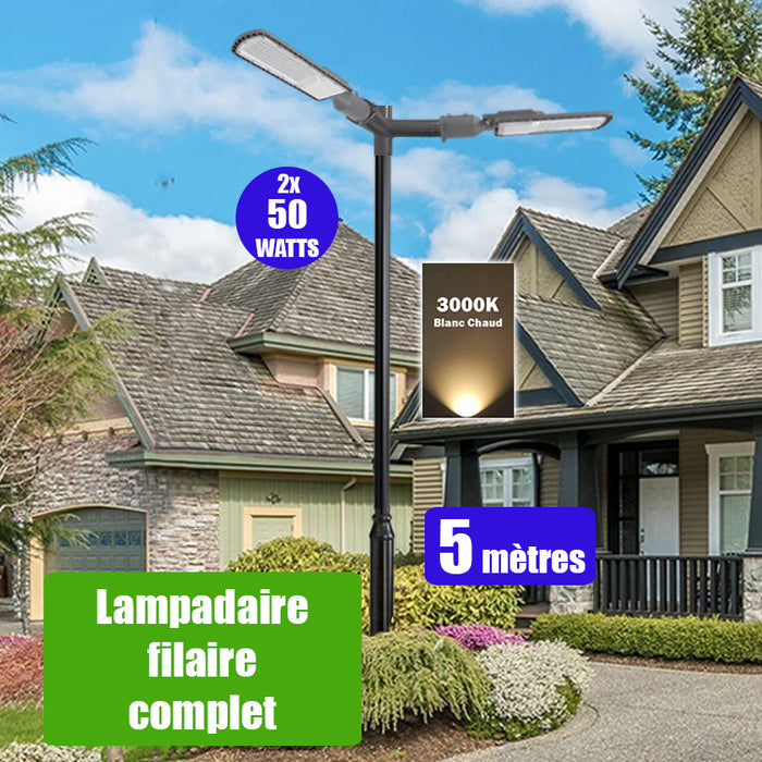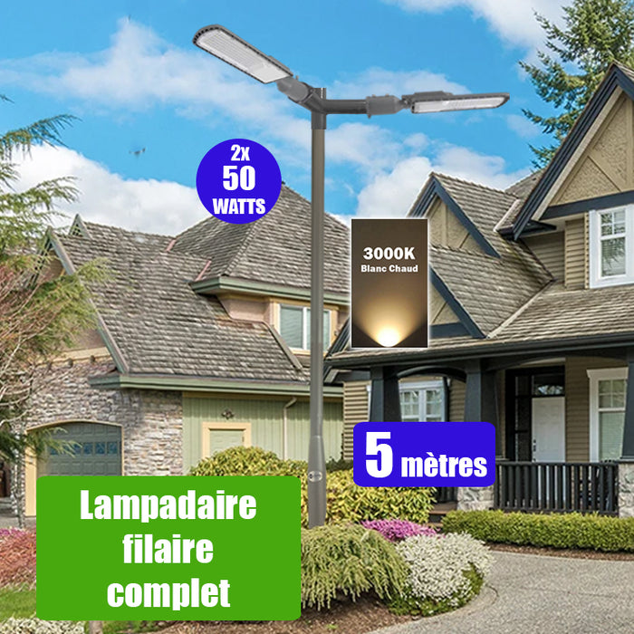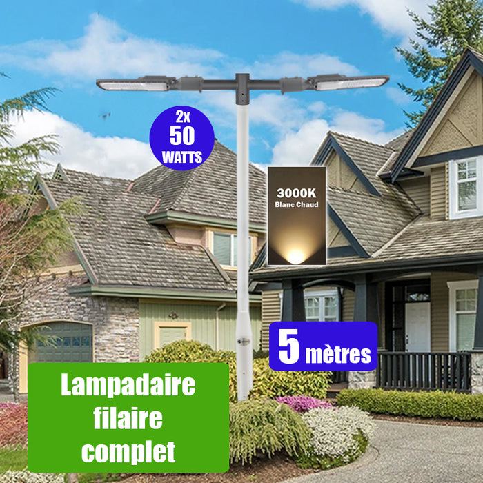 Pack lampadaire filaire complet double tête 5 mètres : 2x Lampes de rue filaire - Série FLEX ECO - 50 Watts - 3000k + Mât STANDARD - 5 mètres avec trappe au choix (STANDARD V2 EVO ou STANDARD V4 EVO) + Double tête de mât + 2x Adaptateurs 60/50 ajustable