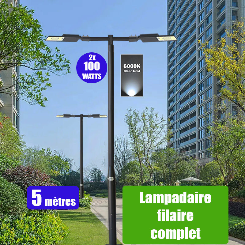 Pack lampadaire filaire complet double tête 5 mètres : 2x Lampes filaires Série FLEX V2 - 100 Watts - 6000k + Mât STANDARD - 5 mètres avec trappe au choix (STANDARD V2 EVO ou STANDARD V4 EVO) + Double tête de mât en ligne ou perpendiculaire