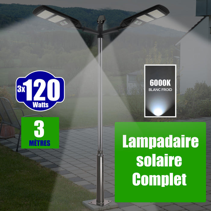 Pack lampadaire solaire complet triple tête 3 mètres : 3x Lampes de rue et parking - Série VIEW V2 - 120 Watts - 6000k + Mât STANDARD 3 mètres au choix (Série STANDARD V1 EVO ou Série STANDARD V4 EVO - Avec trappe) + Triple tête de mât + 3x Adaptateurs