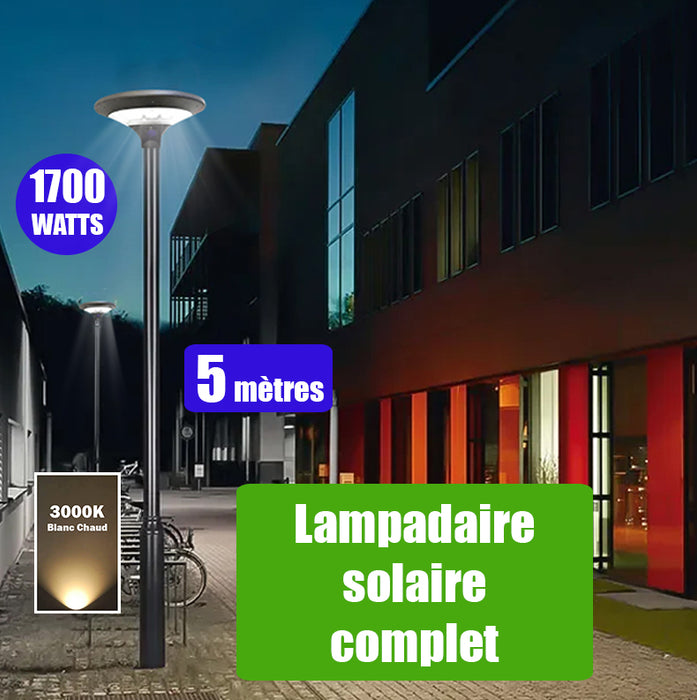 Pack lampadaire solaire complet 5 mètres : Lampe d'extérieur solaire - Série OVNI EVO - 1700 watts - 5100 Lumens - 3000k + Mât STANDARD (V1 EVO ou V4 EVO - Avec trappe)