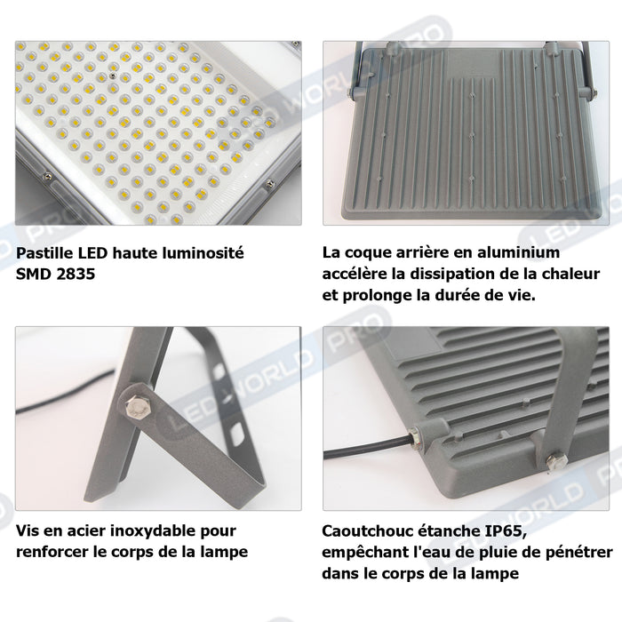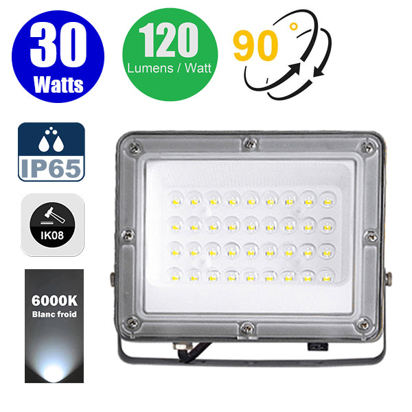 Projecteur LED filaire - Série PERLE V2 - 30 Watts - 3600 Lumens - 120 Lumens/Watt - Angle 90° - IP65 - 6000K - 150 x 123 x 25 mm